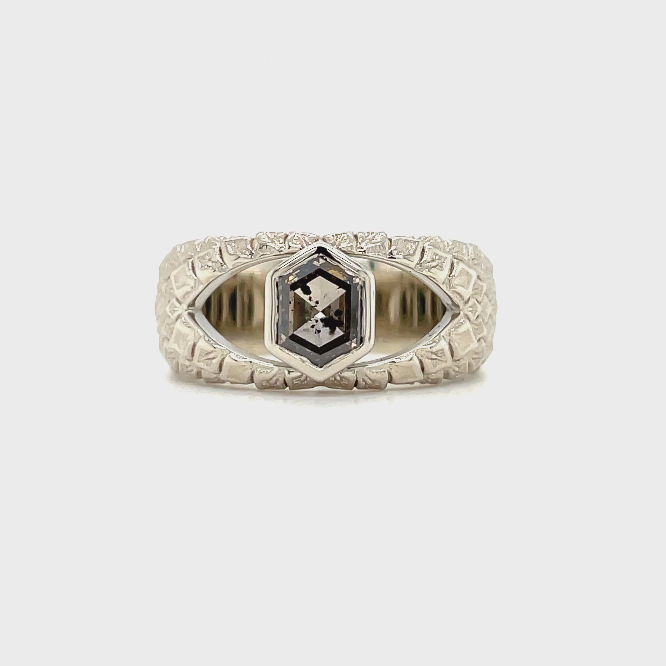 Crafted in 14K unplated white gold, this ring features a 1.16 carat long hexagon rose cut salt and pepper diamond, sourced from Canada. The diamond’s dark gray-brown tone is flecked with a star chart of carbon deposits, like a galaxy of secrets suspended in stone.