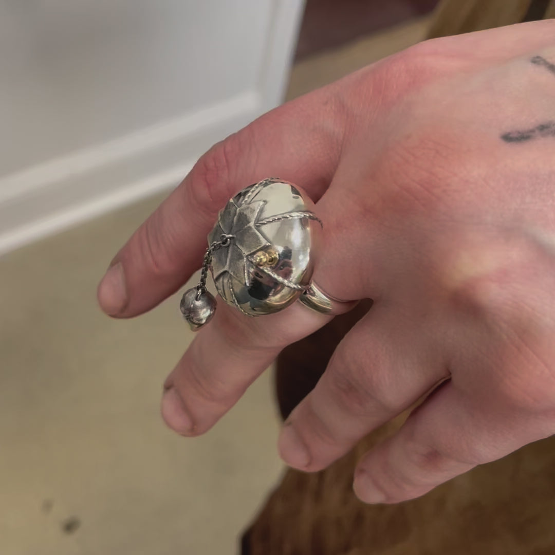 This solid sterling silver ring is inspired by the iconic tomato pin cushion—a staple in sewing kits for generations. Complete with a dangling strawberry “sharpening” charm, this ring brings a touch of vintage whimsy to your jewelry collection.